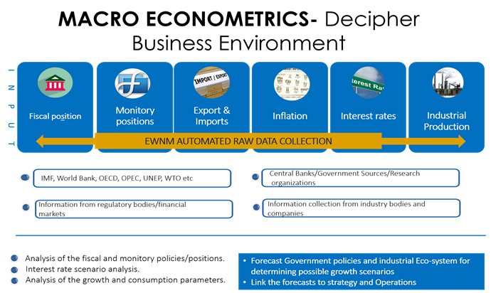 EWNM systematically collect information on macro data for G-20 countries generated by governments, multilateral organizations, central bankers and industry bodies. We focus on the Growth, Interest Rates, Fiscal and Monitory positions, Inflation, Policy, Polity and International Trade, Demand and Supply, and Industrial Production to analyze various geographical regions and industrial sectors. For India, we also look into the micro market in different states so that market access issues can be addressed to start from the best possible locations in India. We have in-house developed algorithms to understand the emerging business trends for a country, geography, industry, currencies and commodities. This information is useful for our clients for international business expansion and financial services companies.